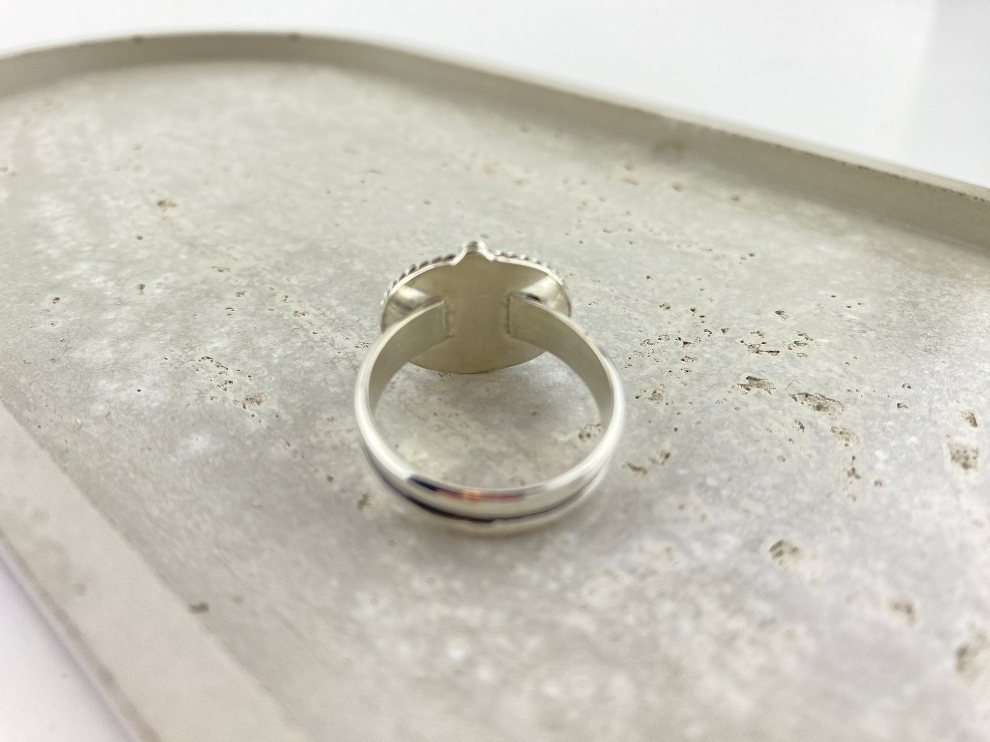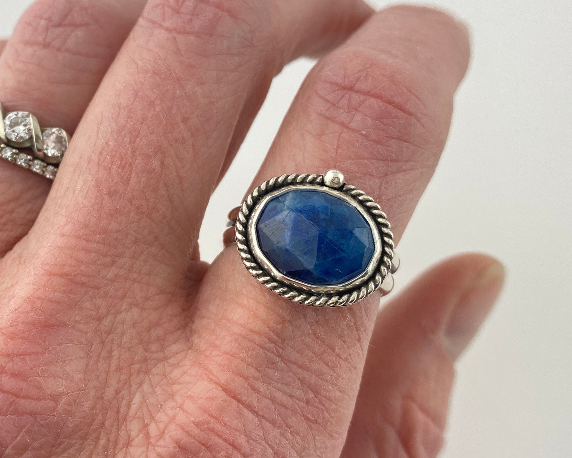 This ring features a beautiful blue, oval, rose cut afghanite stone set in sterling silver. The bezel is encased with a twisted wire, accented with a silver sphere. The afghanite stone in this ring is absolutely gorgeous, like a seemingly bottomless cenote. Jump in! ;)