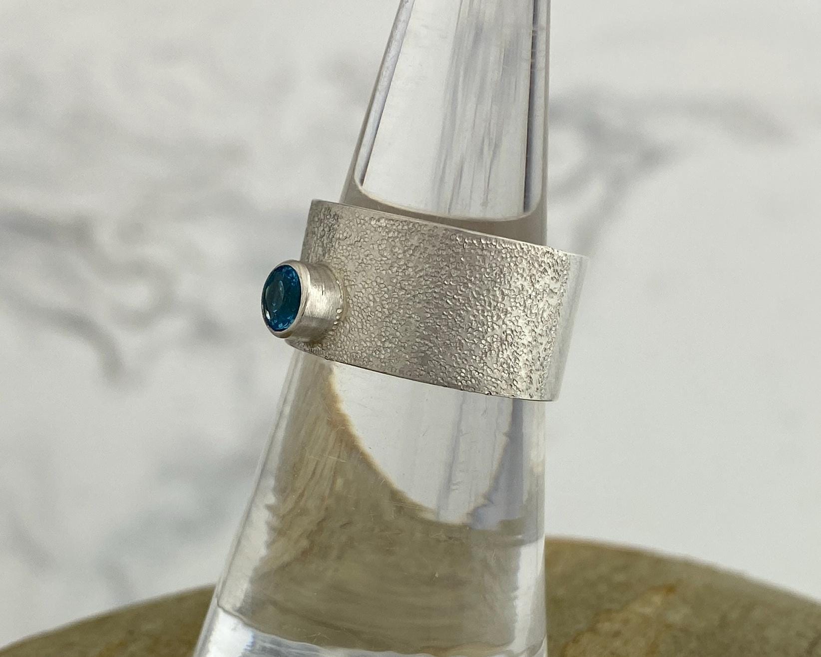 Asymmetrically textured wide band ring, with a 4mm faceted blue topaz stone. The topaz is set in a tube setting, with the texture extending from the middle of one side, to just past the stone. Ring band size is 6 1/4. This style will fit a little snug due to the width of the band.
