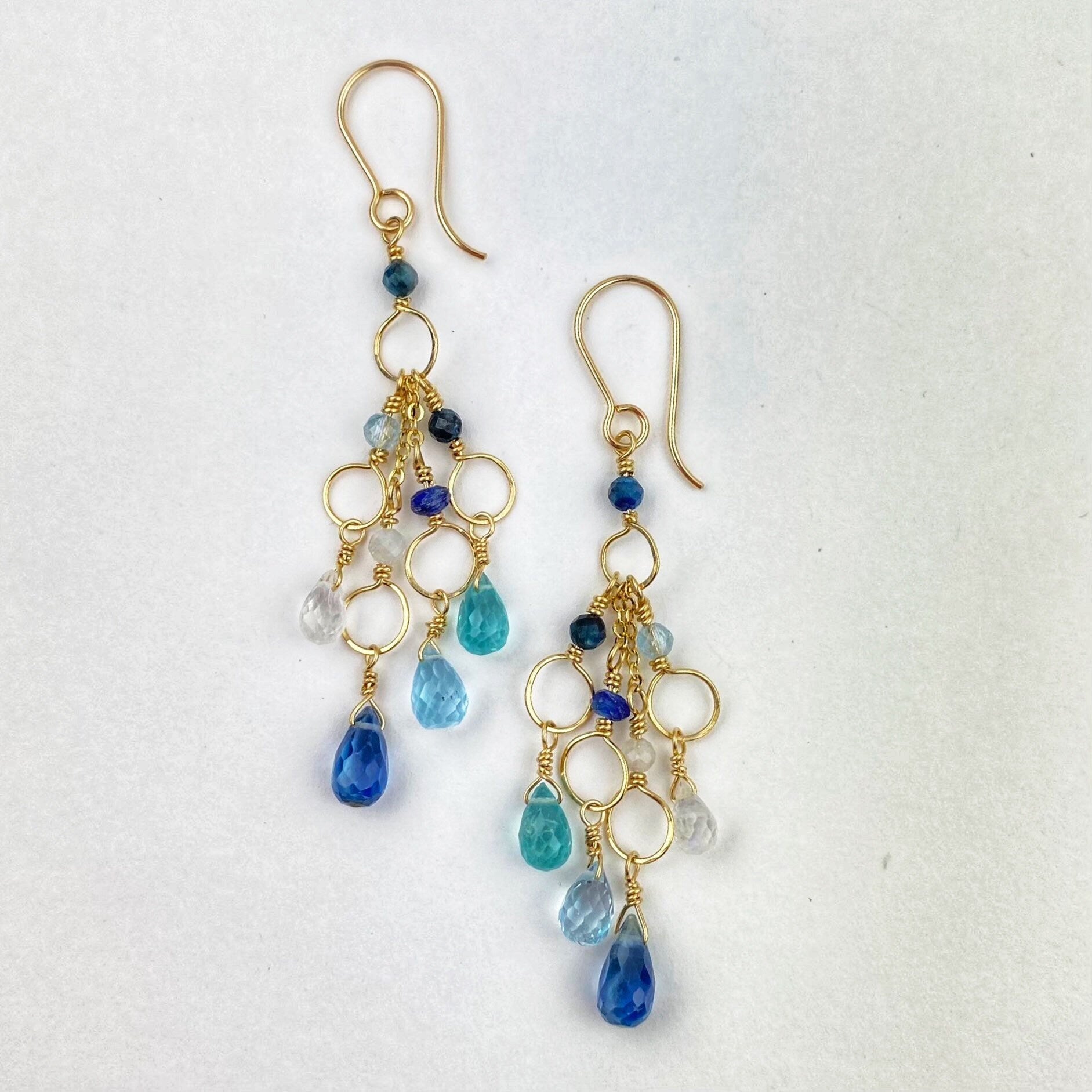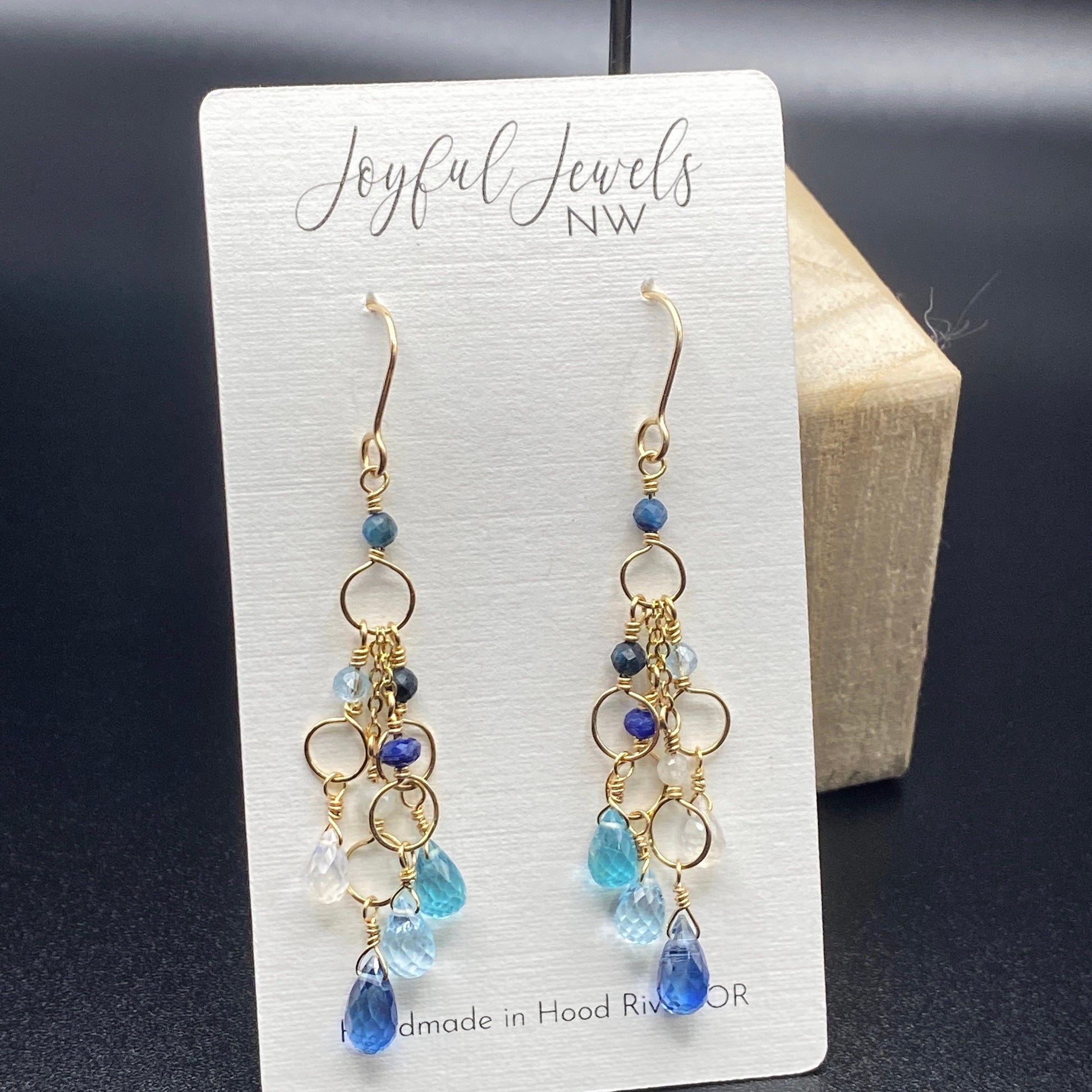 These delicate dangles reach 2.5” in length, but wear as light as a feather. Stones include kyanite, moonstone, blue topaz. These earrings are dainty, but add movement and sparkle to any ensemble.