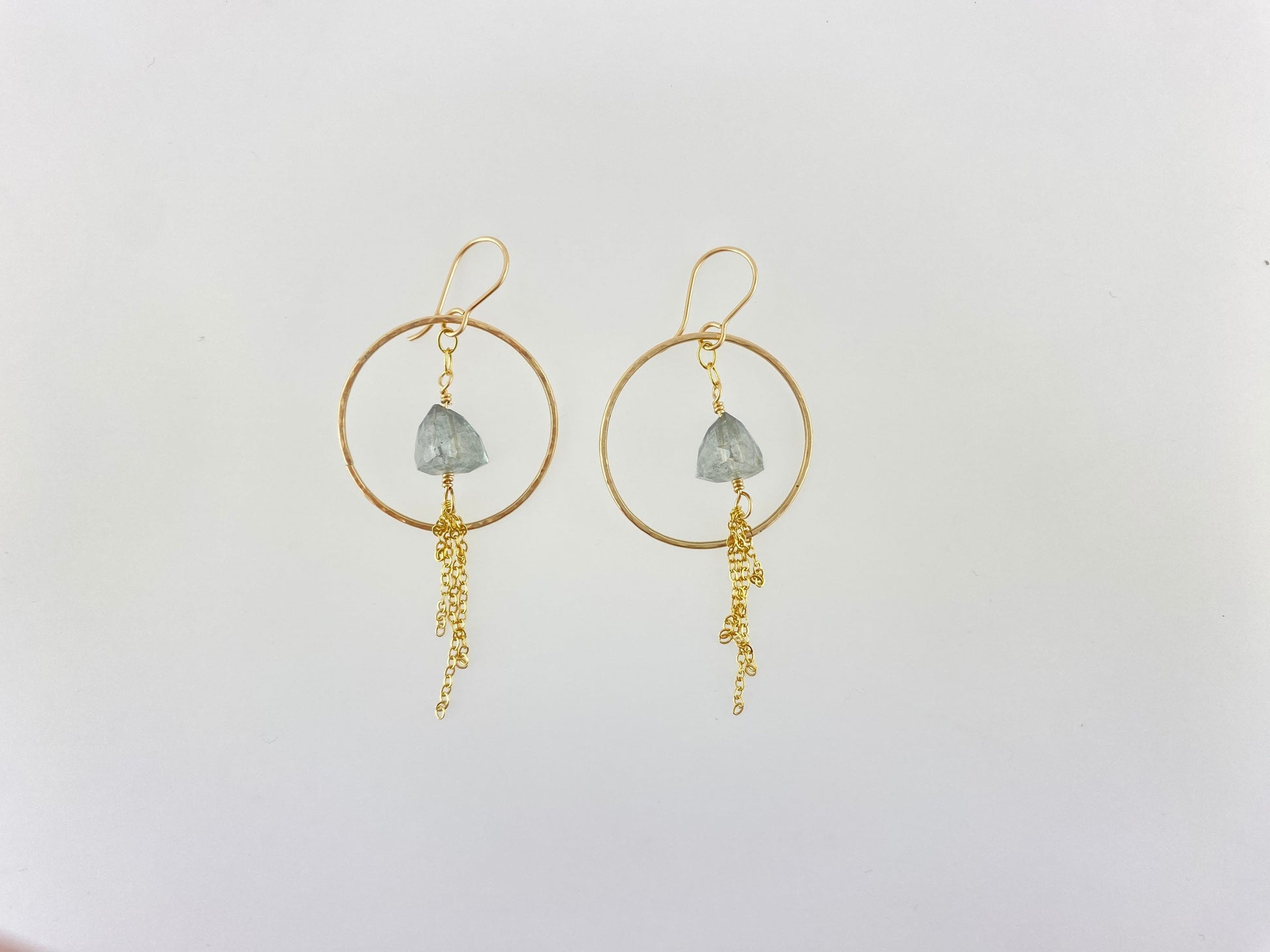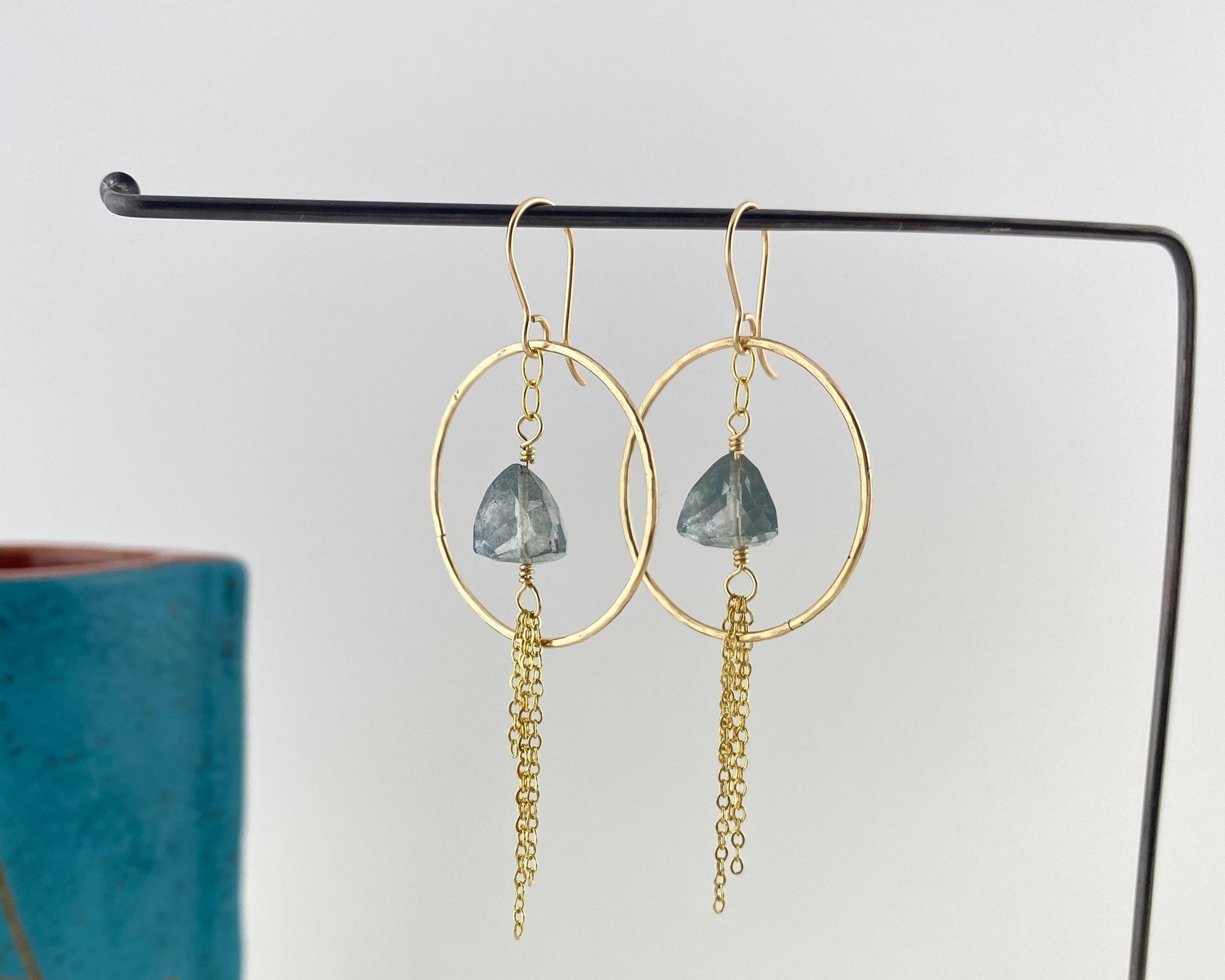 Pyramid teal tourmaline gemstones sparkle in these dainty hoop and chain dangles. These statement earrings are incredibly light weight, very easy to wear. At home on a summer day, and also on date-night! The gold-fill rings are approximately 1 1/4”, with total length approaching 2.5 inches.