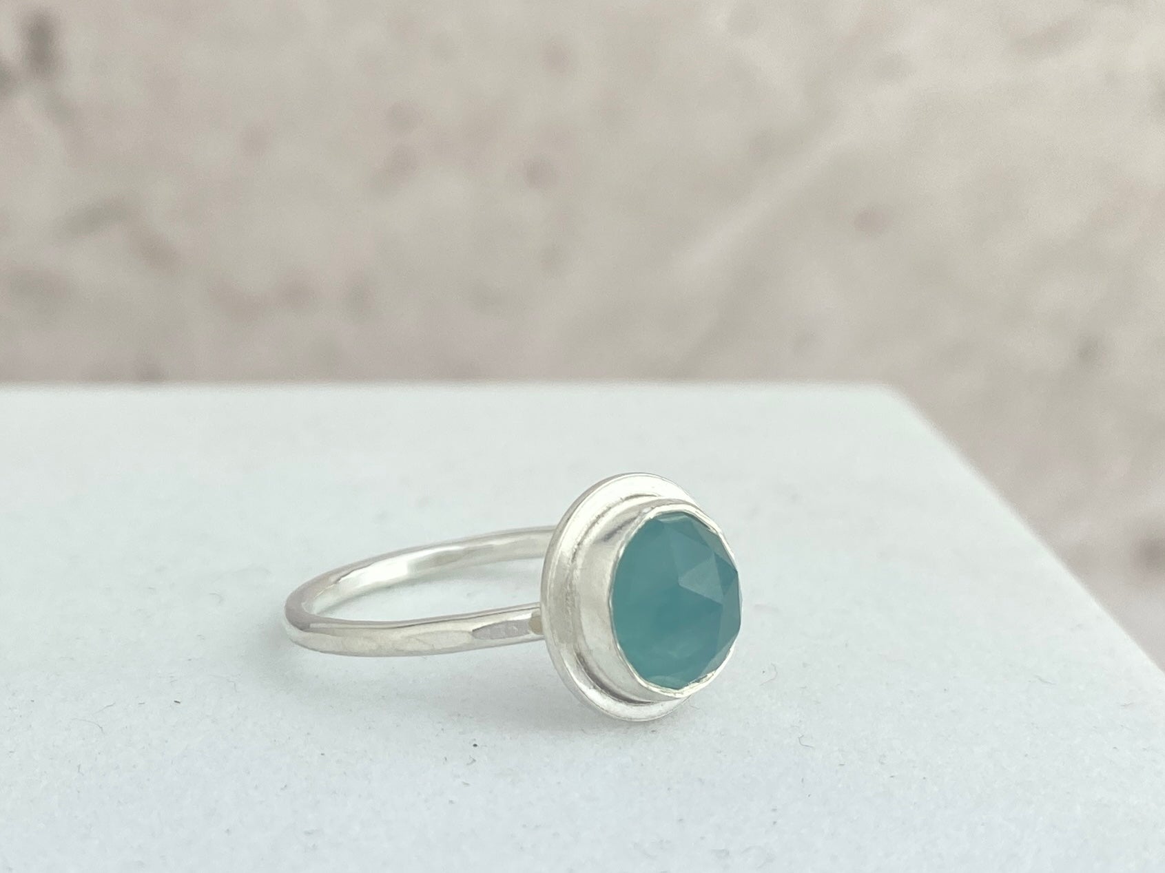 This opaque grandidierite stone is bezel set with a border of silver, attached to a dainty hammered silver band. The stone is a really lovely soft teal color. The band is a size 7. Grandidierite is a relatively rare stone, primarily sourced from Madagascar.