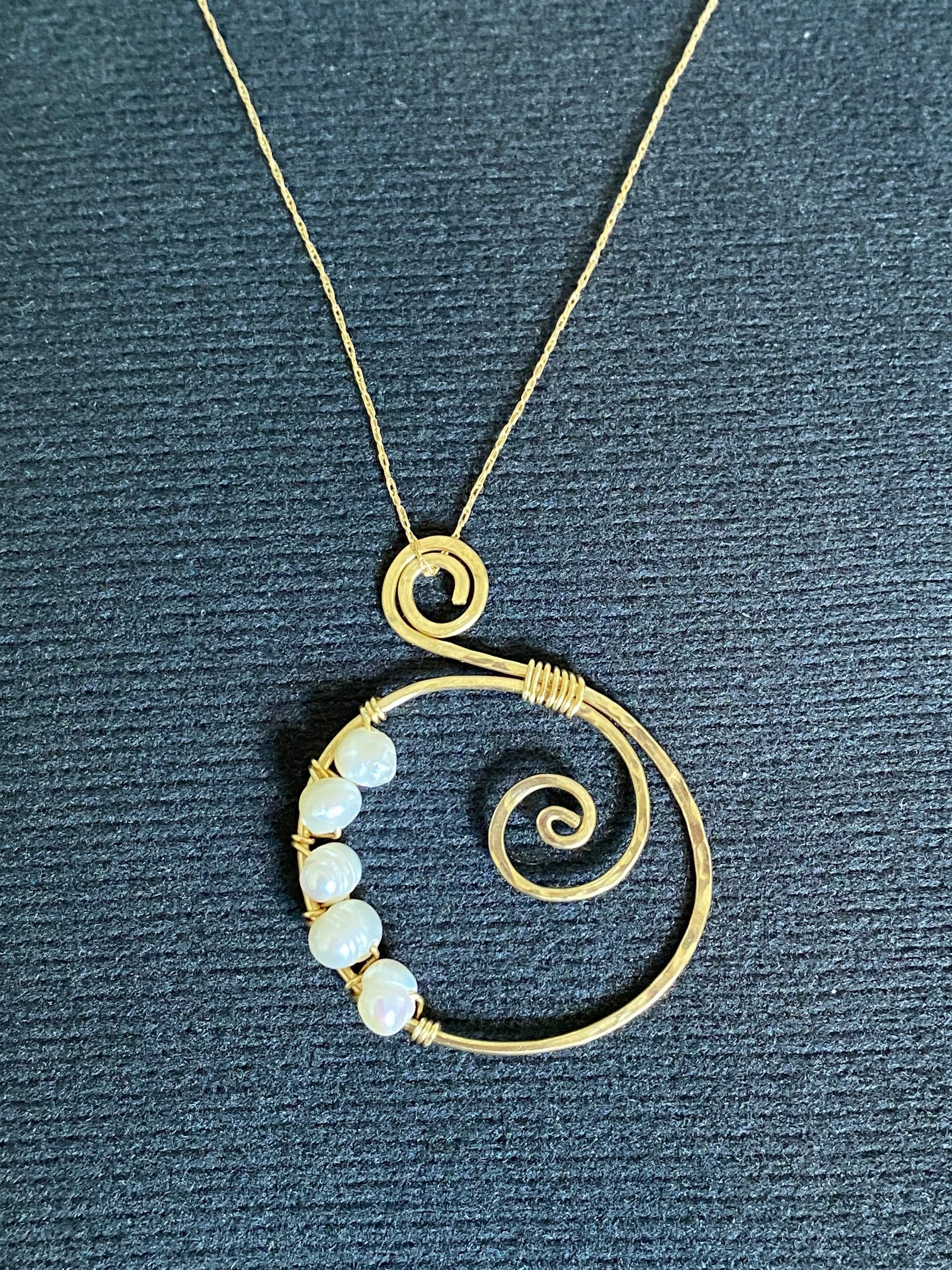 Hammered gold-fill pendant, cultured pearls, spiral and wire wrapped