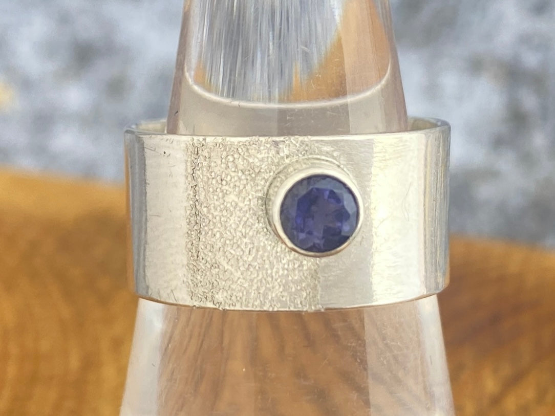 Asymmetrically textured wide band ring, with a 4mm faceted iolite stone, known as Viking’s Sapphire. Iolite was used to help navigate the oceans, due to its optical properties. The stone is set in a tube setting, with the texture starting in the middle of the tube setting and extending to one side. Ring band size is 6.5. This style will fit a little snug due to the width of the band.