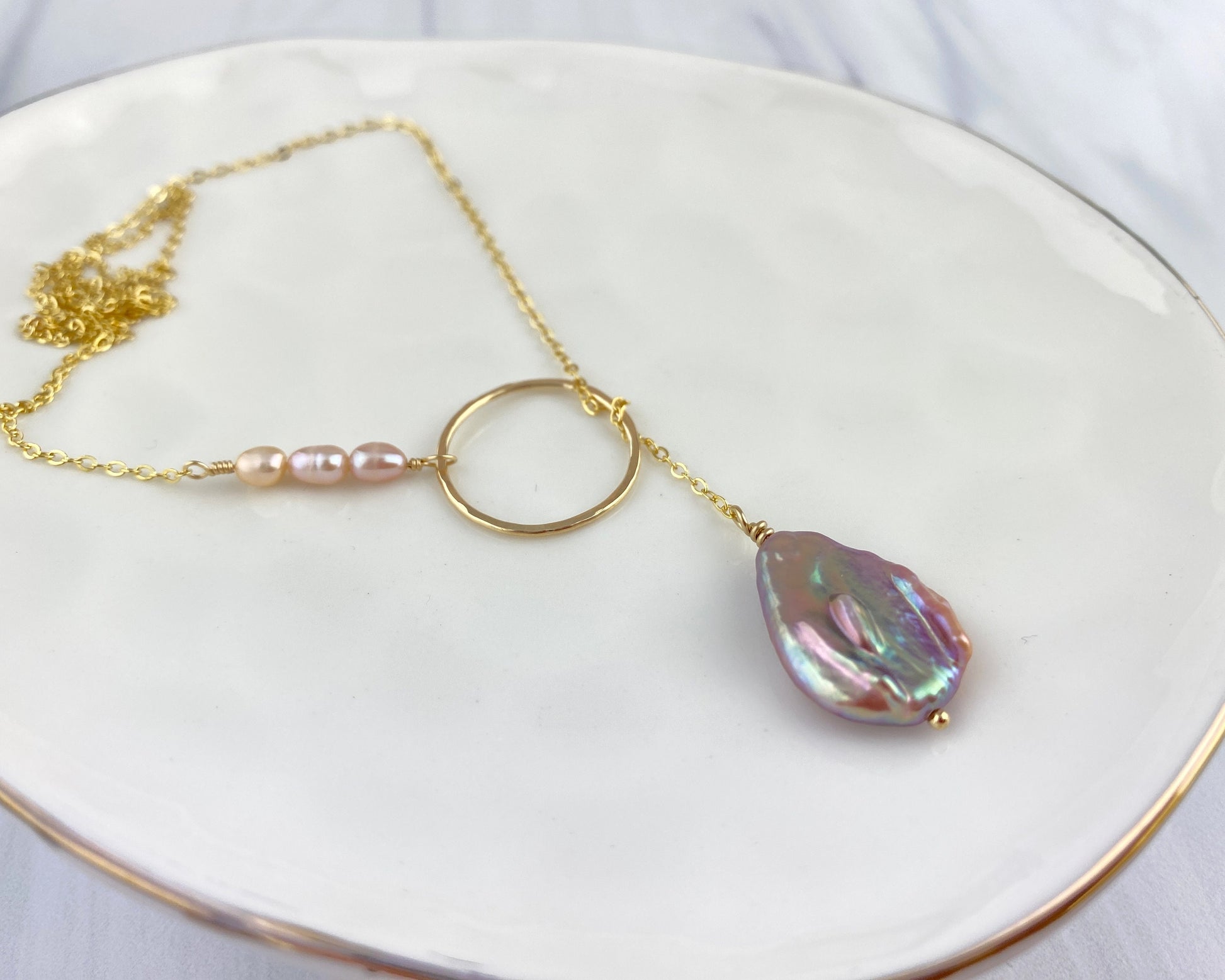 Cultured pink keshi pearl with small pink accent pearls are strung on gold-filled wire and wrapped into a lariat style necklace on a gold-fill chain. A hammered gold-filled circle works as the clasp for this dainty necklace.