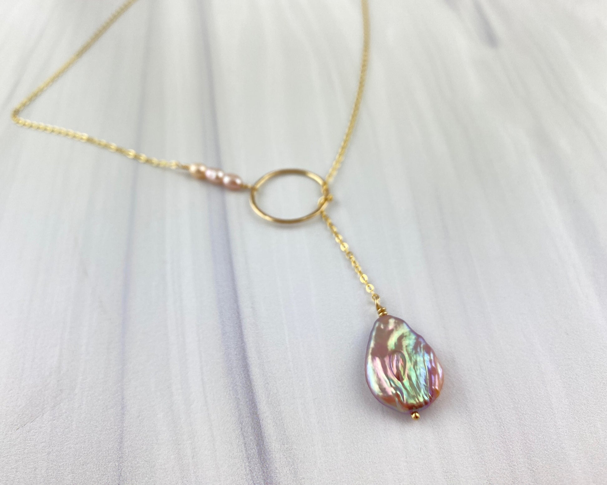 Pearl and gold lariat necklace, dainty, 20”, pink Keshi pearl, bridal jewelry