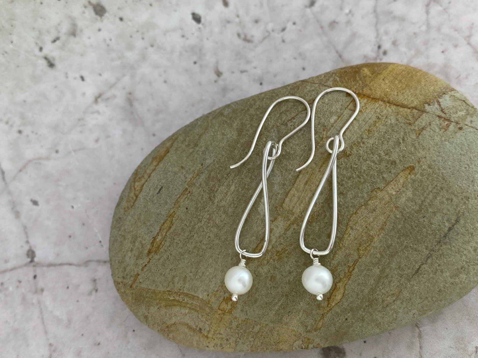 Pearl and silver earrings, twisted sterling drops, white pearl dangles