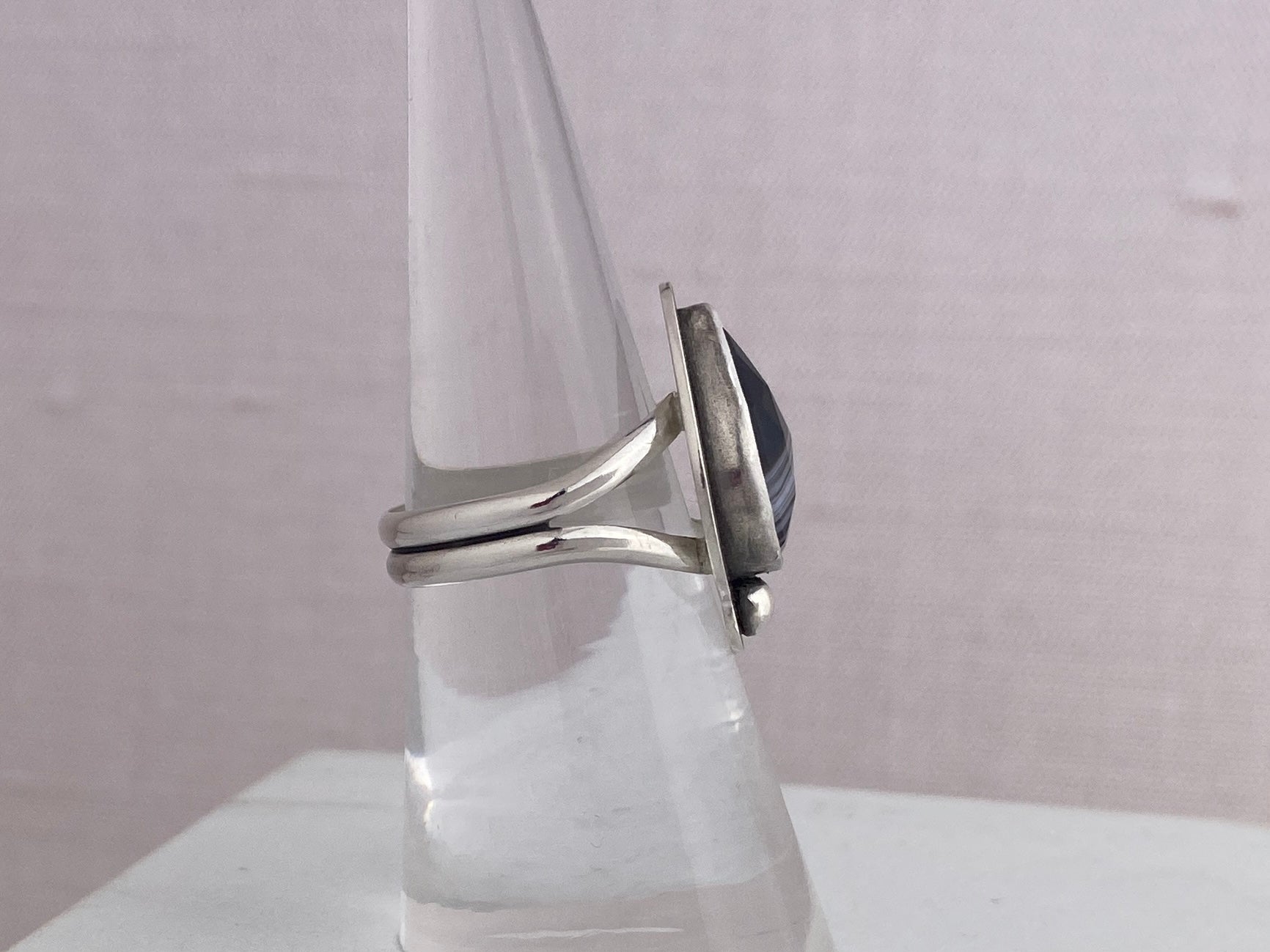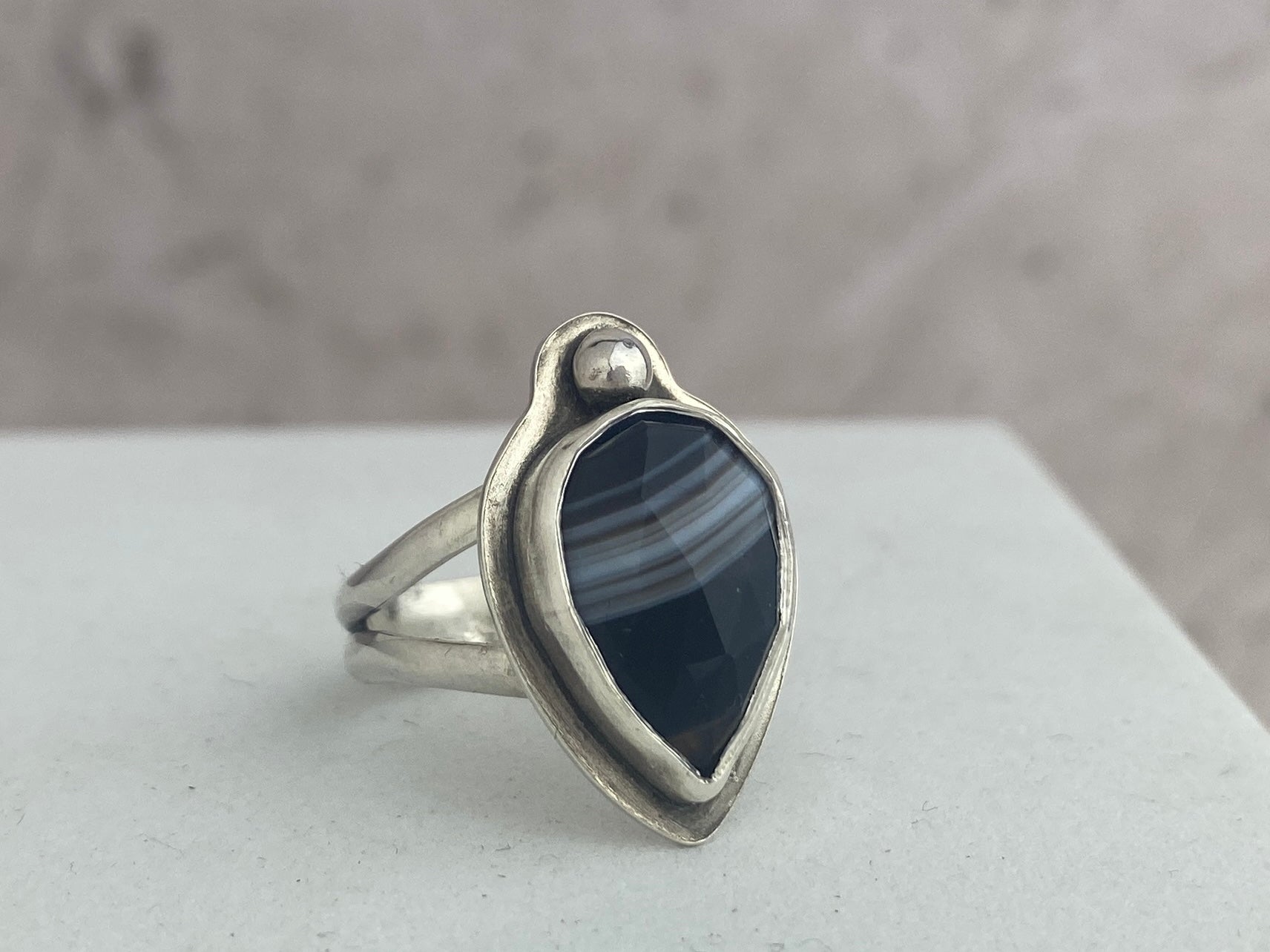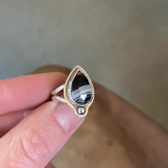 Banded agate ring with a border and accent silver ball, split shank band, size 7. This lovely stone is black with white bands and a slightly brownish tip. The split shank makes the longer style more comfortable to wear.