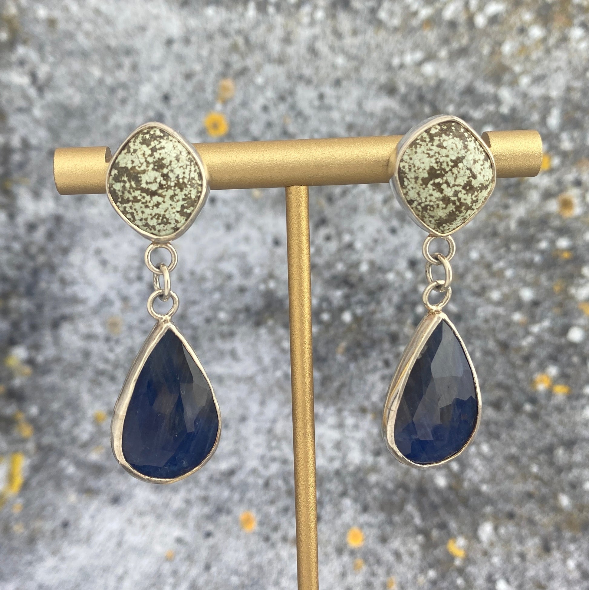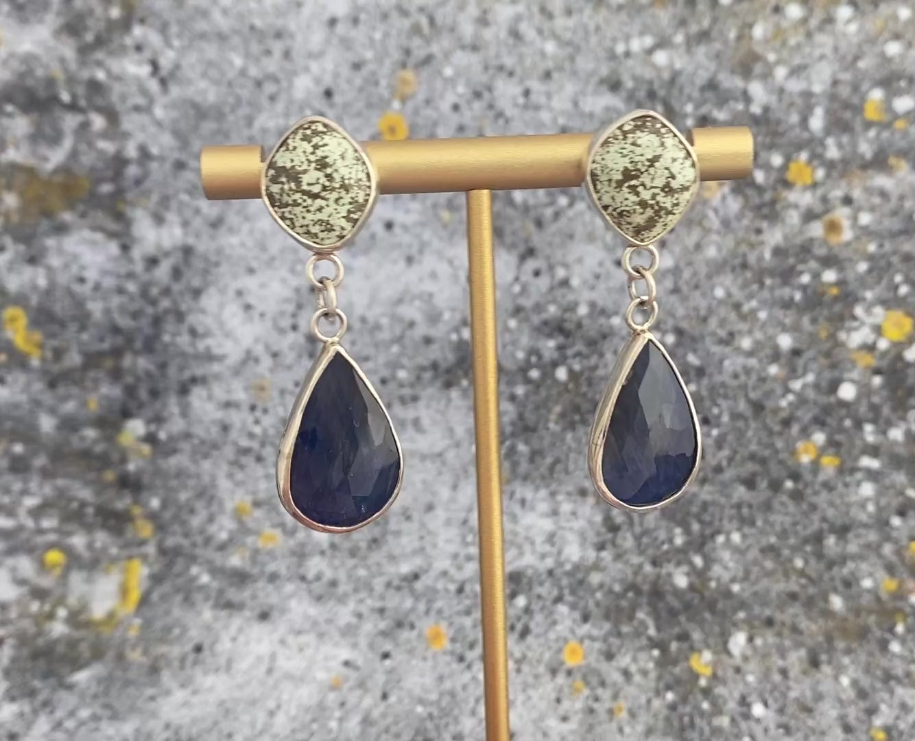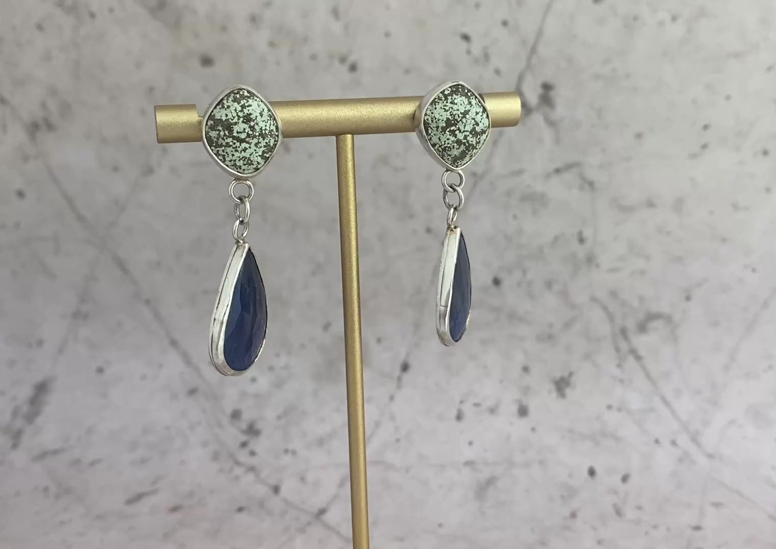 These large rose-cut teardrop shape sapphires really catch the light! They are suspended from a couple links of handmade chain, dangling from a pair of Hubei turquoise studs. All metal is either fine or sterling silver. Total length is approximately 1.75”.