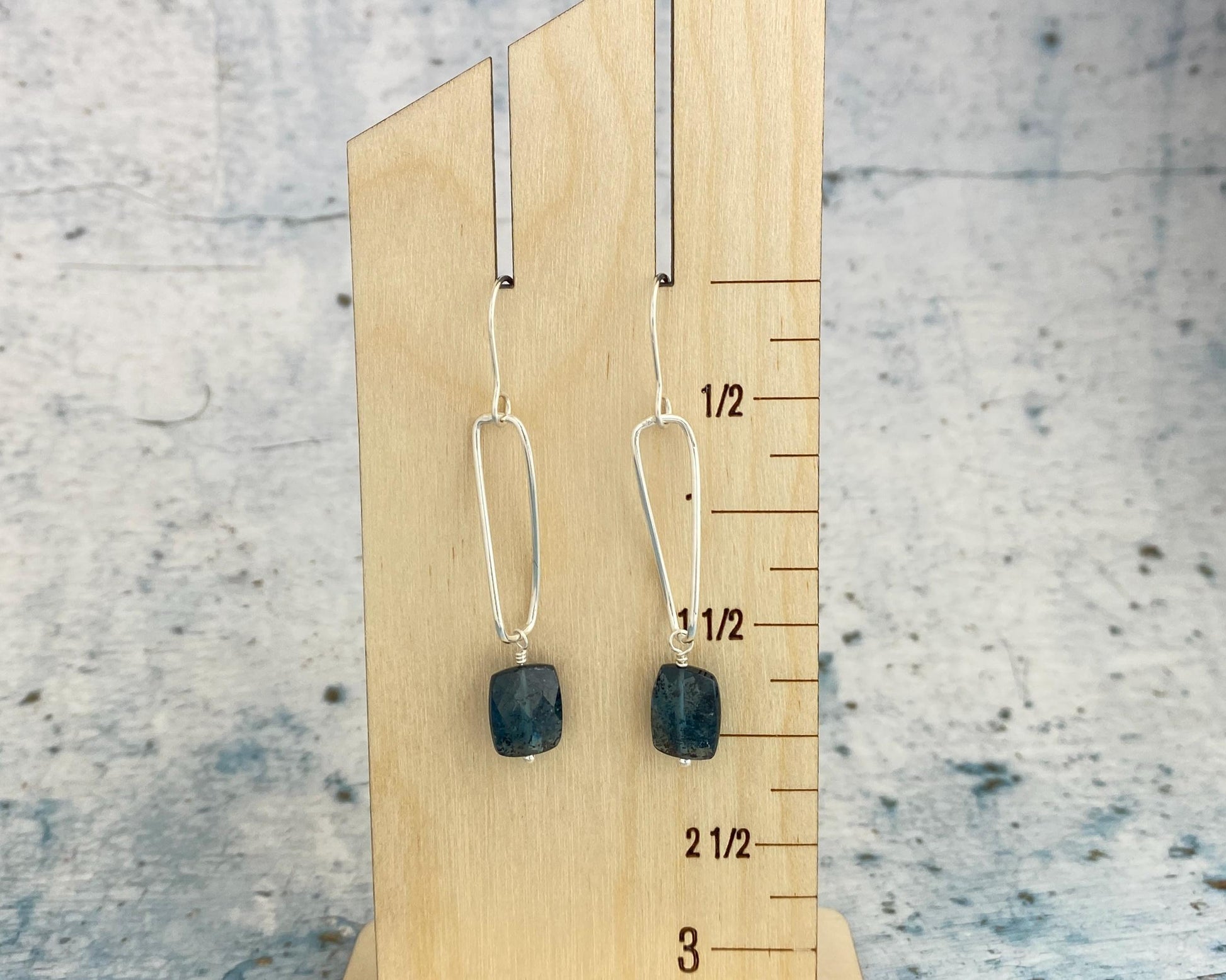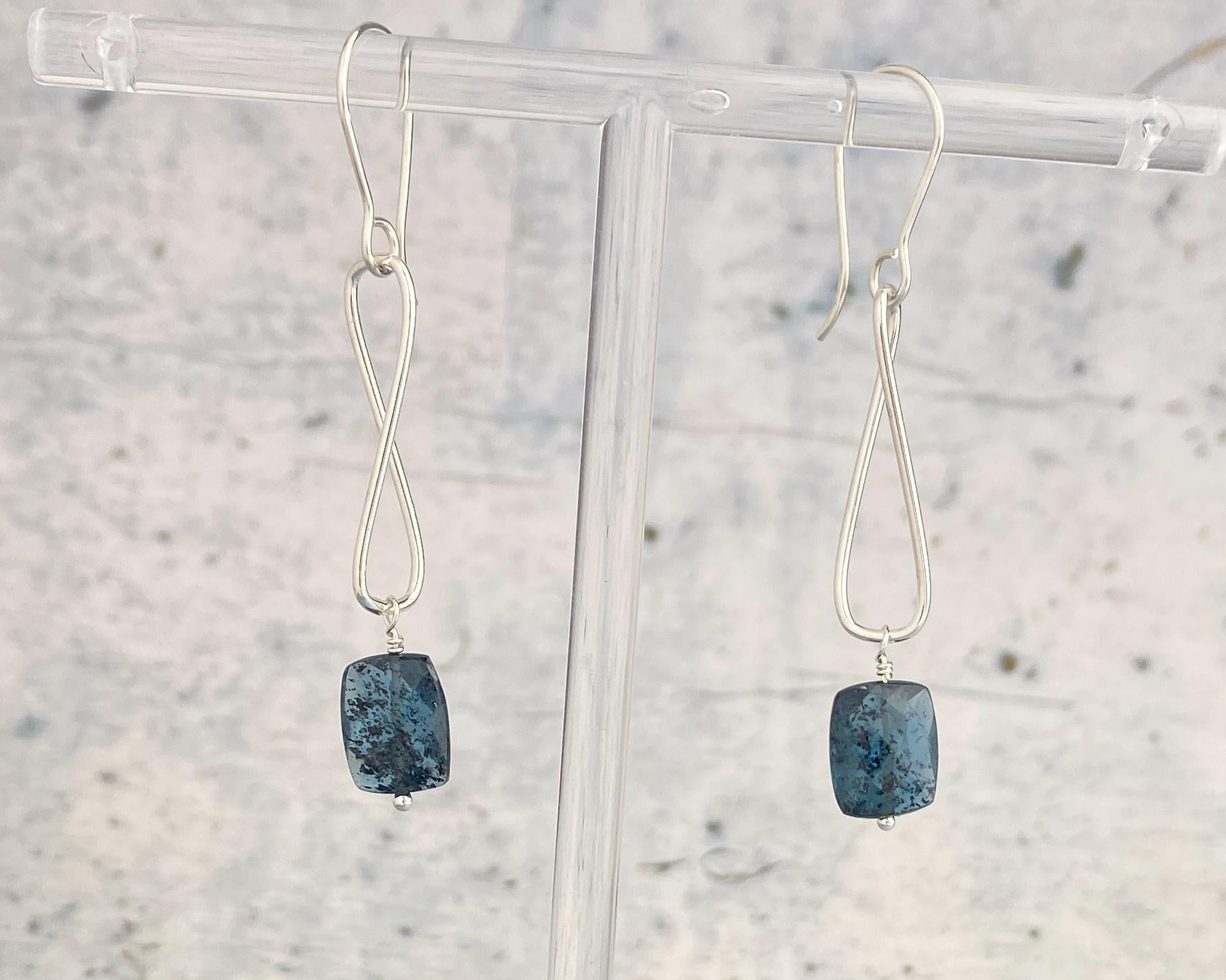 Rectangle shaped faceted teal moss kyanite beads dangle from a twisted hoop of sterling silver. These kyanite beads have such a lovely color! They also have a bit of rainbow iridescence that can be seen in the first picture.