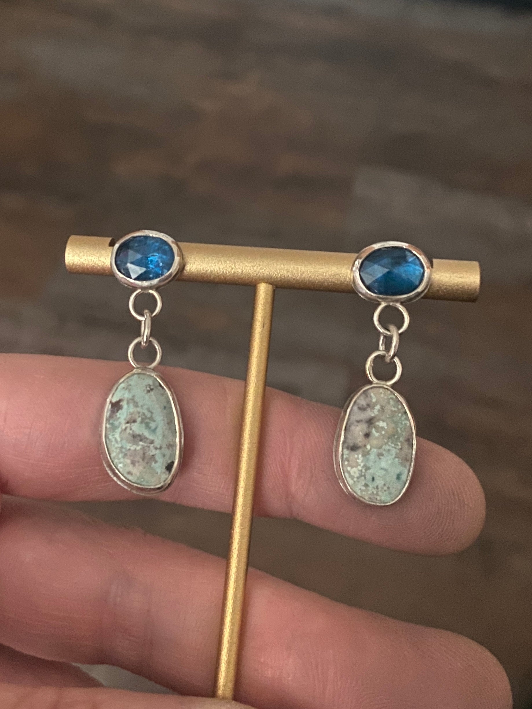 These dangle earrings combine sparkling teal kyanite with a more subdued Hubei turquoise. Hubei turquoise is mined in China, with most teal kyanite originating in Kenya. All metal is either fine or sterling silver. Total length is approximately 1.5”.